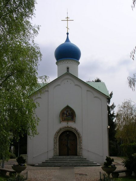 Комментарий автора: "Городок Сент-Женевьев-де-Буа, с которым связана судьба многих представителей русской эмиграции, расположен в 25 километрах от Парижа. В 1927 году в этом городе по инициативе княгини Мещерской открылся Русский дом для престарелых русских эмигрантов. Рядом с кладбищем был куплен участок земли, на котором была построена церковь Успения Божией Матери по проекту художника Александра Бенуа."