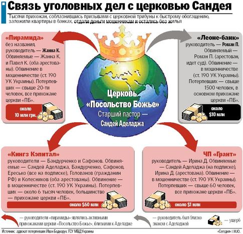 Как рассказал для «Сегодня» старший следователь по особо важным делам Главного следственного управления МВД Украины полковник милиции Сергей Шуваев, отдельные уголовные дела по таким «пирамидам», как «Кингз Кэпитал» и ЧП «Грант», ныне объединены в одно, ввиду того что в обоих обвиняемым (кроме других лиц) проходит старший пастор церкви «Посольство Божье» Сандей Аделаджа (обвинение ему предъявлено по ст. 190, ч. 4 — мошенничество в особо крупных размерах). При этом ущерб по «Кингз Кэпитал» — многие миллионы долларов, цифра растет по мере поступления новых заявлений от потерпевших (а они поступают). Под арестом находится имущество обвиняемых, а это и деньги в банках, и ценные бумаги, и здания, и земельные участки… В том числе арестовано все имущество (дома и машины) Сандея. Он, по словам следователя, не может, например, что-то продать или подарить.