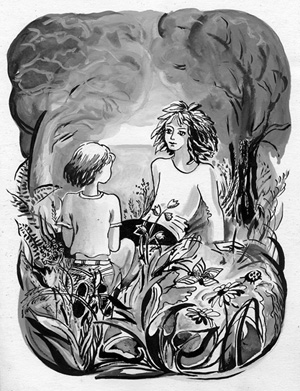 Хотя девочка и утомилась от долгого пути, она не могла усидеть на месте и отпросилась у папы, самого высокого и бородатого геолога, осмотреть окрестности. Немного углубившись в лес, девочка взобралась на пригорок и очутилась на небольшой полянке. Как и во всём лесу, здесь было удивительно тихо. Солнечные лучи словно застывали в воздухе, не достигая земли, отчего воздух был напитан золотом и светился. Золотые звёзды вспыхивали повсюду в высокой траве, и трудно было поверить, что это не звёзды, а лишь головки жёлтых лесных цветов. Девочка медленно вошла в это сияющее царство, томимая сказочным чувством, что сейчас должно произойти что-то невероятное. Действительно, сделав ещё несколько шагов, она едва не наступила на спящего в траве мальчика, и очень удивилась. Жилья по близости не было никакого, а он спал себе так спокойно, что не выглядел усталым или заблудившимся. Откуда он здесь взялся? Озадаченная девочка опустилась перед ним на колени. Ей очень хотелось его разбудить, но она не решалась это сделать. Он был очень симпатичный: крупные правильные черты лица, угольно- чёрные, сросшиеся на переносице брови, золотистая кожа и алые, по-детски пухлые губы, к которым прилипла выпавшая из приоткрывшегося во сне рта сухая травинка. От длинных прямых ресниц мальчика на лицо почему-то не падала тень, волосы его были очень странного цвета, напоминавшего опавшие листья. Причём не сразу опавшие, а когда они уже немного пожухнут и приобретут общий коричневатый оттенок. Цвет волос его был непостоянен: наклонишь голову в одну сторону – один оттенок, в другую наклонишь – другой! Словом, очень необычные волосы! Не в силах ожидать, пока он проснётся, девочка двумя пальчиками осторожно взяла с его губ травинку и пощекотала у него под носом. Брови его сдвинулись в одну полоску, нос сморщился, но глаз он не раскрыл. Тогда девочка, посмеиваясь, снова его пощекотала. Мальчик убрал одну руку из-под головы и взмахнул ею перед лицом, словно отгоняя назойливую муху. Едва сдерживаясь от смеха, девочка сунула травинку ему в нос. Мальчик отфыркнулся и раскрыл глаза.