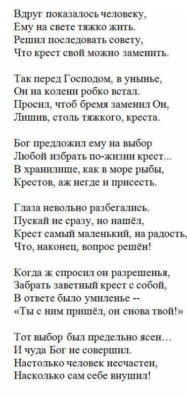 Спасибо, Владимир. Я люблю эту "народную" христианскую притчу. Но в Вашей стихотворной интерпретации она нашла в себе прекрасный вариант. Поделюсь с Вами, что в моем арсенале тоже имеются притчи. Правда, их всего три. Это распространенные христианские притчи, авторов которых никто не знает. Я много раз слышала их, и так полюбила, что решила переложить их на стихи, несколько дополнив их :) Названия притч: "Молитва бамбука", "Яма" и "Двое". Все они выложены здесь, на этом сайте (их можно легко найти через поиск). Буду рада, если прочитаете :) Благословений Вам!